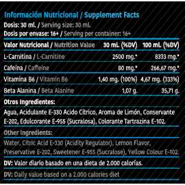 Agua, 10% L-Carnitina base, Acidulante E-330 (Ácido cítrico), Aroma limón. Cafeína anhidra, Conservante E202 (sorbato Potásico, Edulcorante E-955 (Sucralosa), (Vitamina B6 Piridoxina Clorhidrato, Colorante Tartazina E-102.